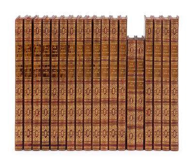 19 volumes, various sizes from octavo and smaller. Numerous etched plates and in-text illustrations in each volume, with folding frontispieces in the last five (two hand-colored). Later polished red calf gilt, spines in 6 compartments with 5 raised bands, citrus morocco lettering-pieces gilt in 2, others completely gilt, all edges gilt, stamp-signed by Riviere & Son (a touch of light rubbing to a few volumes).