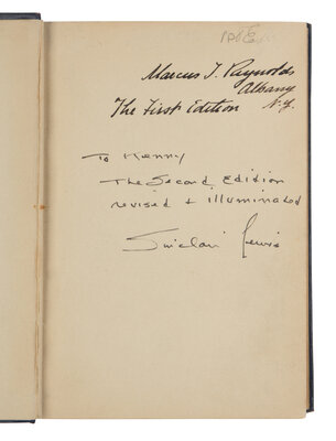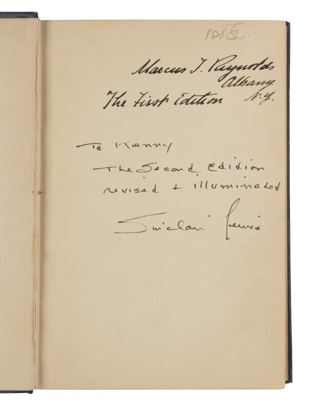 FIRST EDITION, FIRST ISSUE with "Purdy" and "my fellow" on p.49. INSCRIBED BY LEWIS on the front free endpaper: "To Kenny, the second edition revised & illuminated, Sinclair Lewis."