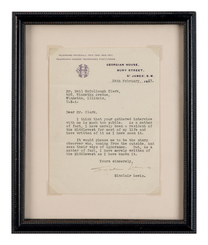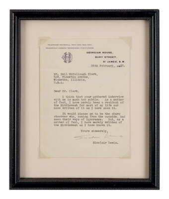 Lewis writes in response to an interview with the recipient, discussing the author's Midwest roots and how they have influenced his writing. In his highly acclaimed 1920 satirical novel, Main Street, Lewis critiques the conformity and narrow-mindedness of small-town life in the American Midwest, helping shape the literary image of the region as both culturally conservative and deeply emblematic of broader American values.
