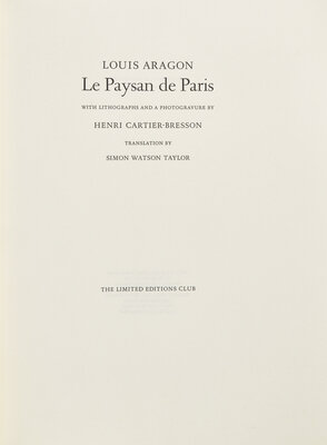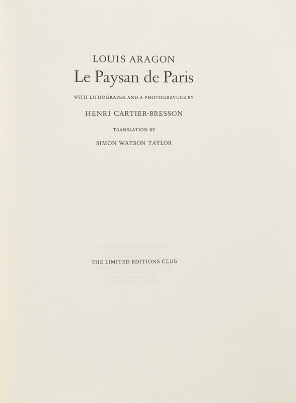 LIMITED EDITION, number 109 of 300 copies signed by Cartier-Bresson. Le Paysan de Paris comprises two main sections, each offering a surrealistic view of the Avenue de l'Opera and the Parc des Buttes Chaumont, respectively.