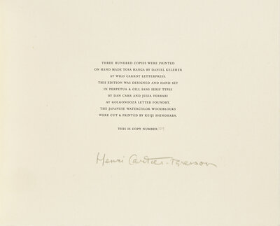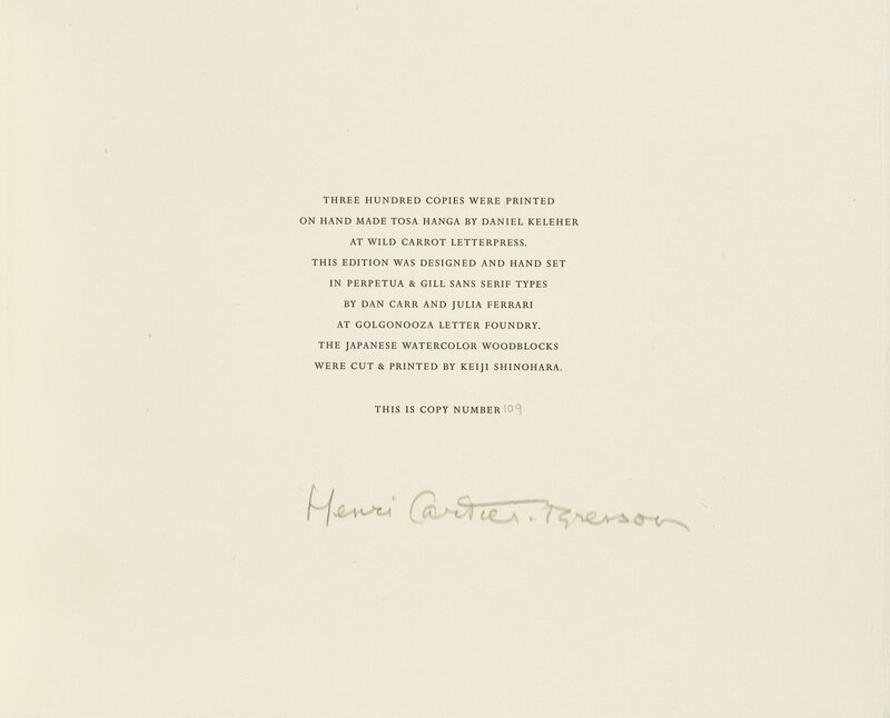 Oblong folio. Illustrated with watercolor woodcut plates by Henri Cartier-Bresson. Original quarter tan niger over beige cloth-covered boards, stamped in gilt; matching beige cloth fall-down-back box. Publisher's prospectus laid in.
