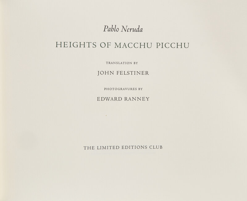 [LIMITED EDITIONS CLUB]. NERUDA, Pablo (1904-1973). Heights of Macchu Picchu. Translated by John Felstiner. New York: The Limited Editions Club, [1998].