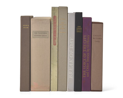 8) GRASS, Gunther. The Flounder. New York: The Limited Editions Club, 1985. 3 volumes, 4to. Original quarter eel skin over gray cloth-covered boards; publisher's original advertisement laid-in; in gray cloth-covered slip case. LIMITED EDITION, number 780 of 1000 numbered copies, signed on the colophon by Grass.