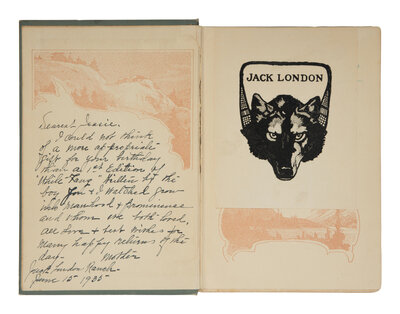 ASSOCIATION COPY, INSCRIBED BY LONDON'S STEP-SISTER AT JACK LONDON RANCH: "Dearest Jessie(?), I could not think of a more appropriate gift for your birthday than a 1st edition of 'White Fang' written by the boy you & I watched grow into manhood & prominence and whom we both loved. All love & best wishes for many happy returns of the day- Mother. Jack London Ranch, June 15 1935." Eliza Shepard moved to Beauty Ranch, Glen Ellen, in 1910, where Jack hired her as both ranch supervisor and overseer of the Wolf House Project. Following Jack's death, Eliza partnered with his widow, Charmian, and continued to handle most business matters, including the continuation of the ranch and movie rights.