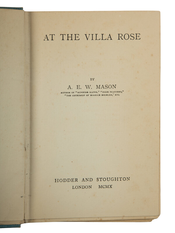 MASON, Alfred Edward Woodley (1865-1948). At the Villa Rose. London: Hodder & Stoughton, 1910.