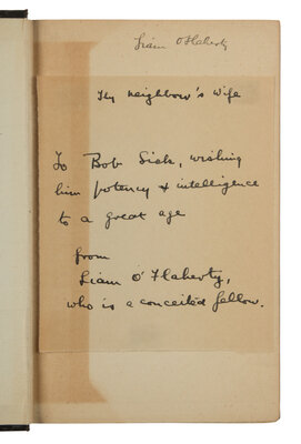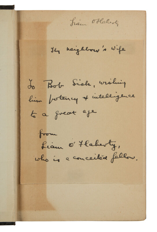 FIRST EDITION OF THE AUTHOR'S FIRST NOVEL. SIGNED BY O'FLAHERTY on the front free endpaper. Tipped in with an autograph note signed: "Thy Neighbor's Wife. To Bob Siek(?), wishing him potency + intelligence to a great age, from Liam O'Flaherty, who is a conceited fellow."