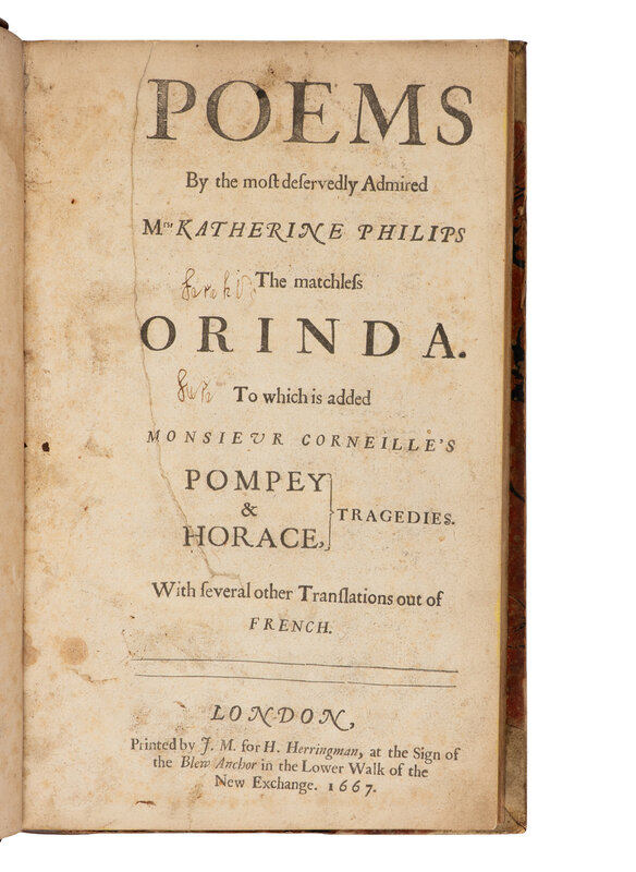 PHILIPS, Katherine (1631/2-1664). Poems by the Most Deservedly Admired Mrs. Katherine Philips, the Matchless Orinda. London: Printed by J.M. for H. Herringman, 1667.
