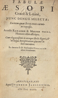 [CHILDREN'S BOOKS]. AESOP. Fabulae Aesopi Graece & Latine, nunc denuo selectae... Daniel Heinsius, editor. Amsterdam: Johannes Janssonius, 1649.