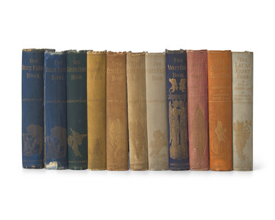 A NEARLY COMPLETE FIRST EDITION SET OF LANG'S FAIRY BOOKS. Comprising: The Blue Fairy Book, 1889 (with another copy of the same, fourth edition, 1890); The Green Fairy Book, 1892; The Yellow Fairy Book, 1894; The Pink Fairy Book, 1897 (with another copy of the same); The Grey Fairy Book, 1900; The Violet Fairy Book, 1901; The Crimson Fairy Book, 1903; The Orange Fairy Book, 1906; The Lilac Fairy Book, 1910 (publisher's printed ad laid in).