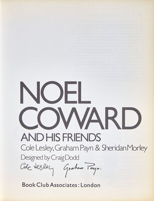 3) LESLEY Cole, Graham Payne, and Sheridan MORELY. Noel Coward and His Friends. London: Book Club Associates, (1979). 4to. Publisher's cream colored cloth (lightly soiled); dust jacket. FIRST EDITION, PRESENTATION COPY, inscribed by authors Cole Lesley and Graham Payne on front free endpaper, dated September 1979. Additionally signed by both authors on title-page.