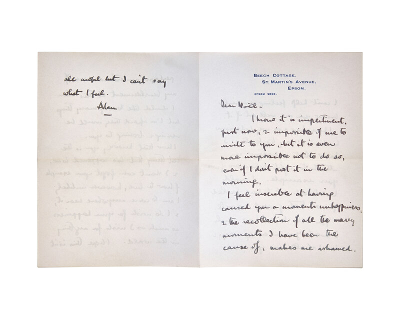1) WEBB, Alan. Autograph letter signed, to Coward, Epsom, 18 December 1937 (post-mark). On bifolium. "Dear Noel, I know it is impertinent, just now, & impossible of me to write to you, but it is even more impossible not to do so, even if I don't post it in the morning. I feel miserable at having caused you a moments unhappiness, & the recollection of all the many moments I have been the cause of, makes me ashamed...I know how poor my behaviour has been to say the least, & I know what importance you attach to right behaviour from your example. I should have liked to not have failed you...You will know how much I owe to you in every way; & how I shall miss you..." Accompanied by original hand-addressed envelope, and two color photographs of Webb and Coward, dated February 1972.
