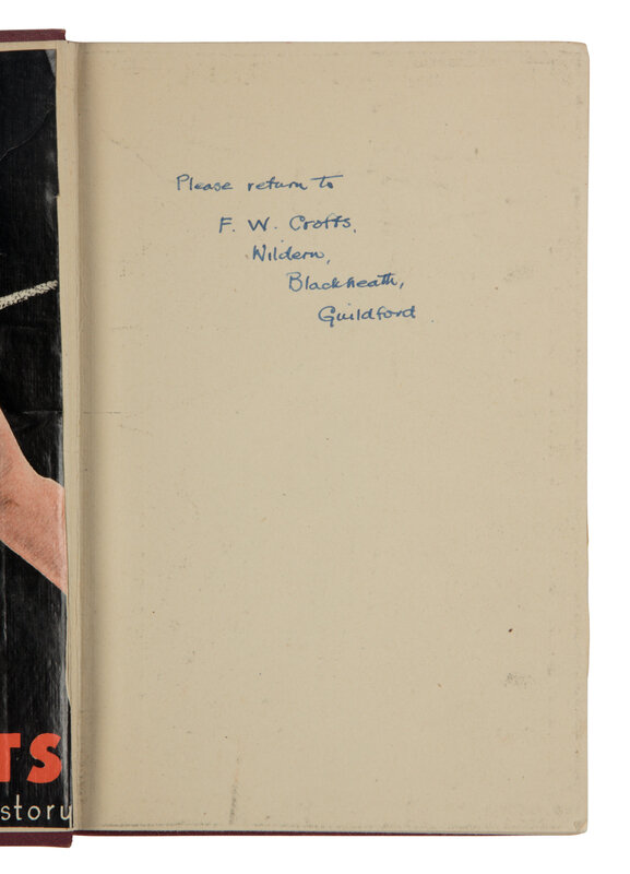 8vo. Original burgundy cloth lettered in white (spine sunned and leaned, some spotting to covers, dust jacket mounted to pastedowns). Provenance: F.W. Crofts (notation on front free endpaper, "Please return to F.W. Crofts, Wilern, Blackheath, Guildford"; holograph cancellations to several pages with typed corrections mounted to entries).