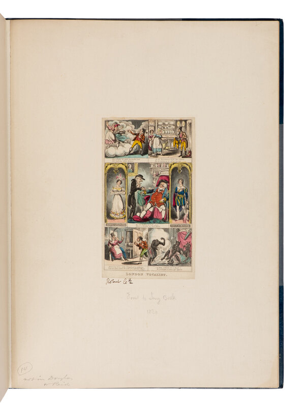 [With:] CRUIKSHANK, Robert. Colored etching, titled "London Vocalist." N.p., n.p., n.d. [ca 1820]. 6 1/2 x 4-in. Neatly mounted, matted, and bound in a folio, half blue morocco. SIGNED BY ROBERT CRUIKSHANK on the mount. Provenance: J. Barton Townsend (bookplate). "A rare print, said to be unknown by bibliographers" (sale note, Parke-Bernet Galleries, 26 February 1942, lot 188). Erroneously catalogued as being signed in the hand of George Cruikshank.