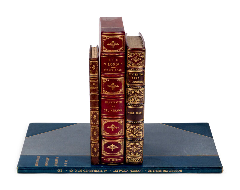 [With:] CRUIKSHANK, Robert, illustrator. -- EGAN, Pierce. Finish to the Adventures of Tom, Jerry, and Logic, in their pursuits through Life in and out of London. London: W. Strange, 1830. 8vo. Hand-colored aquatint frontispieces and 35 hand-colored plates after Cruikshank. Modern full niger gilt. FIRST EDITION, first issue with engraved title and engraved woodcuts on pp.7, 40, and 42.