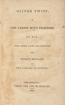 DICKENS, Charles (1812-1870). Oliver Twist; or, The Parish Boy's Progress. By Boz. With Other Tales and Sketches, From Bentley's Miscellany, and The Library of Fiction. Philadelphia: Carey, Lea and Blanchard, 1837.