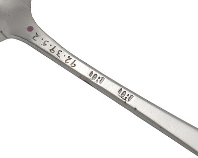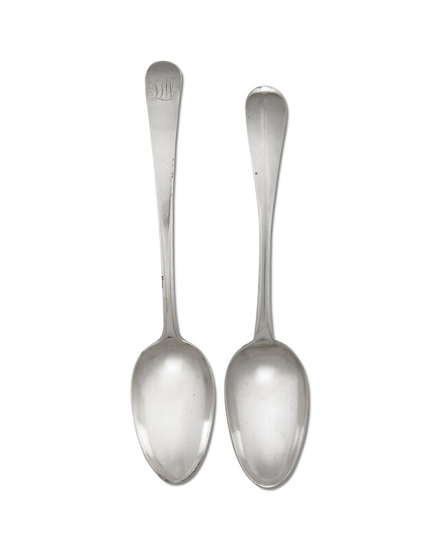 the first, of Hanoverian mid-rib form, with shell at bowl back, engraved with monogram, "S.H," marked twice; the second, with drop at bowl back, engraved with monogram, "SLW," marked twice; both bearing accession numbers, "92.39.5.1" and "92.39.5.2," respectively.
