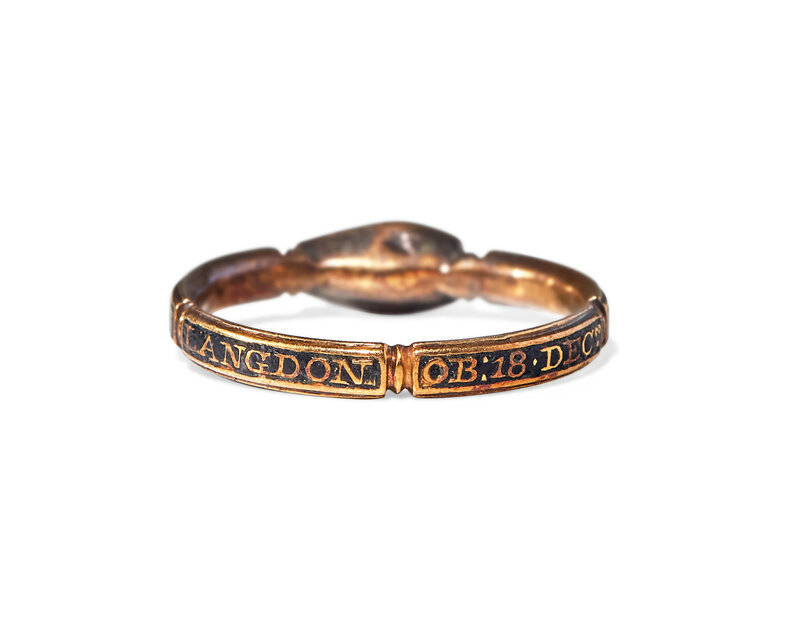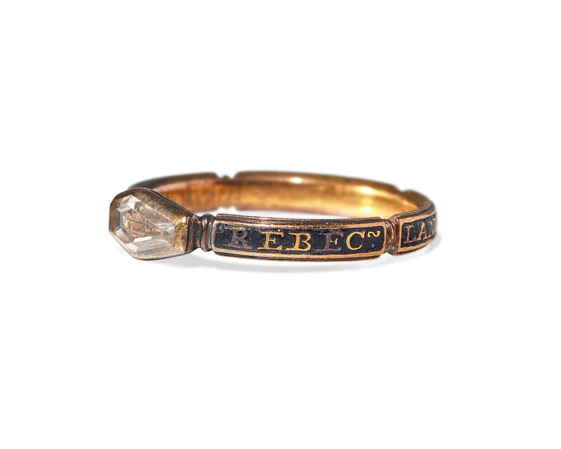 with coffin-shaped bezel and faceted crystal mount, with skeleton beneath, the band inscribed, "Rebec.- Langdon Ob: 18 Dec.- 1734 Ae: 33."