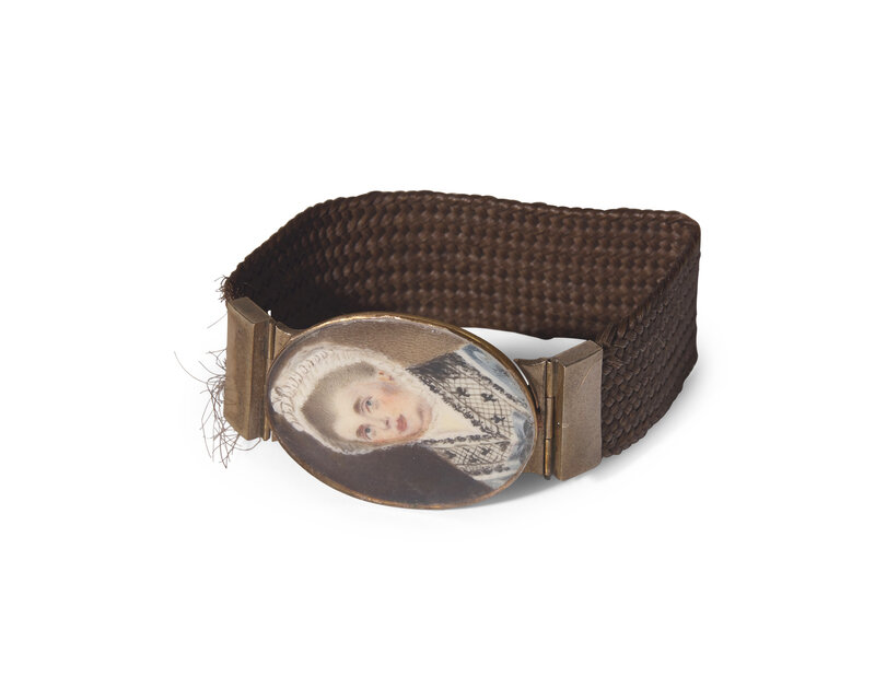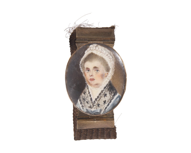 woven hairwork band, with gilt clasp containing portrait miniature, watercolor.