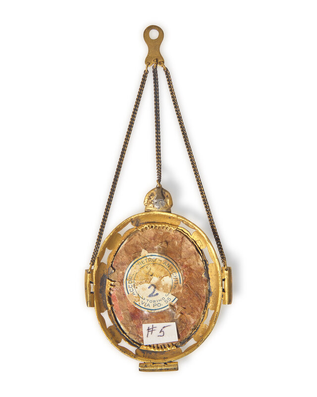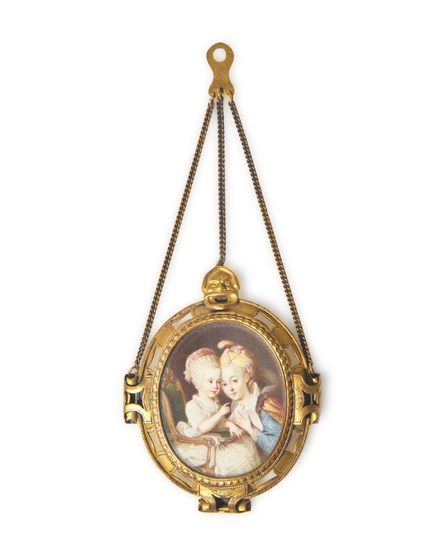 the miniature possibly late 18th century, depicting an infant in a high chair with older child standing beside her and holding a white dove, watercolor, housed in Neoclassical gilt pierced metal pendant case, circa 1880.