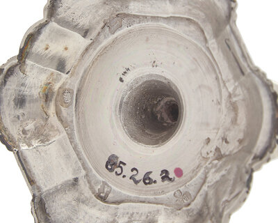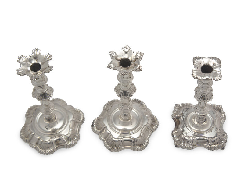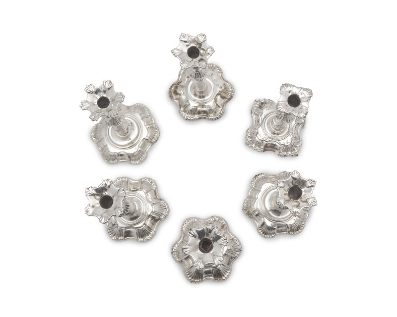 comprising two pairs, each by John Cafe, one pair with date mark for 1748, the other pair with date mark for 1755, and bearing engraved armorial crest to base; a single taper stick, by John Cafe, with date mark for 1753; and a single taper stick, by John Preist, with date mark for 1751; all with detachable bobeches, marked to underside, each bearing accession number, "85.25.1," "85.25.2," "85.26.1," "85.26.2," "85.27," and "85.28," respectively.
