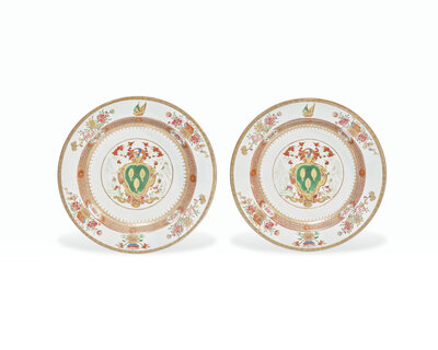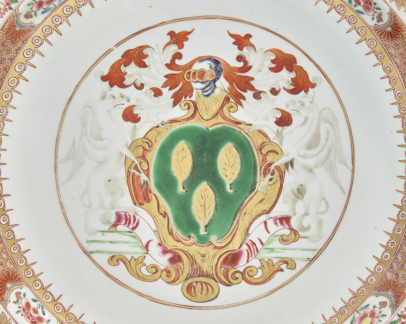 A Pair Of Large Chinese Export Porcelain Chargers Bearing The Arms Of Woodward