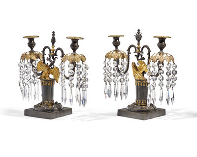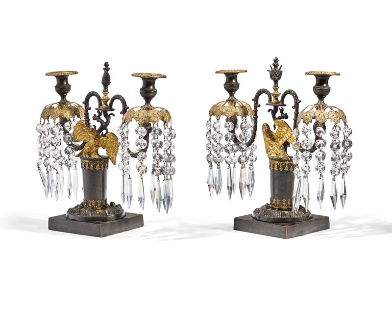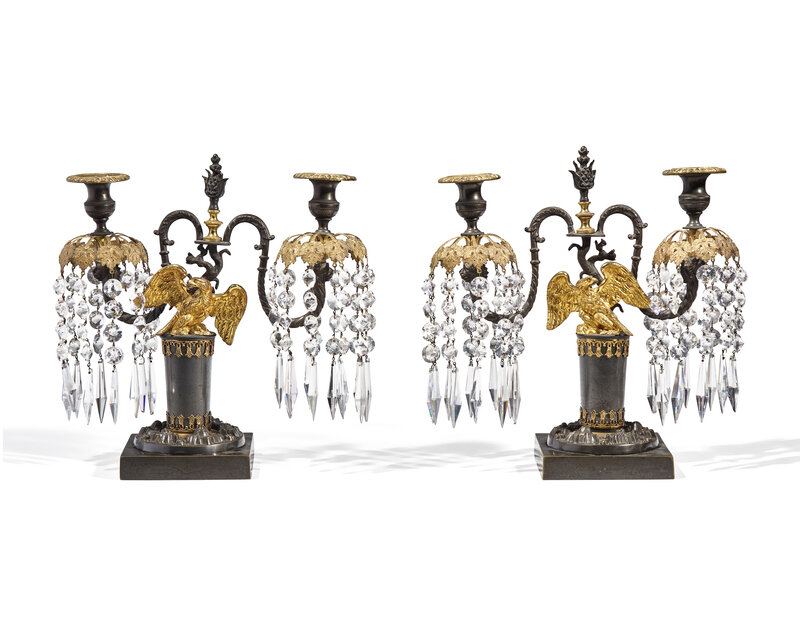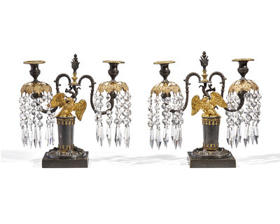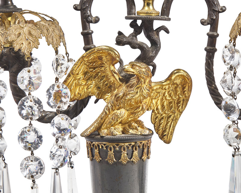 A Pair of George III Patinated and Gilt-Bronze Eagle-Decorated Two-Light Girandoles