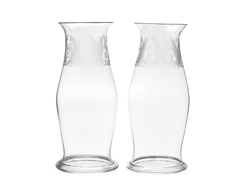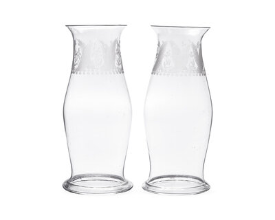 A Pair Of Cut And Etched Uncolored Glass Hurricane Globes