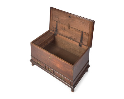 with molded lid having iron strap hinges, molded waist over three short drawers, molded base on bun feet, the interior with till over a series of three miniature drawers, the side with red-painted accession number, "52-7-10."