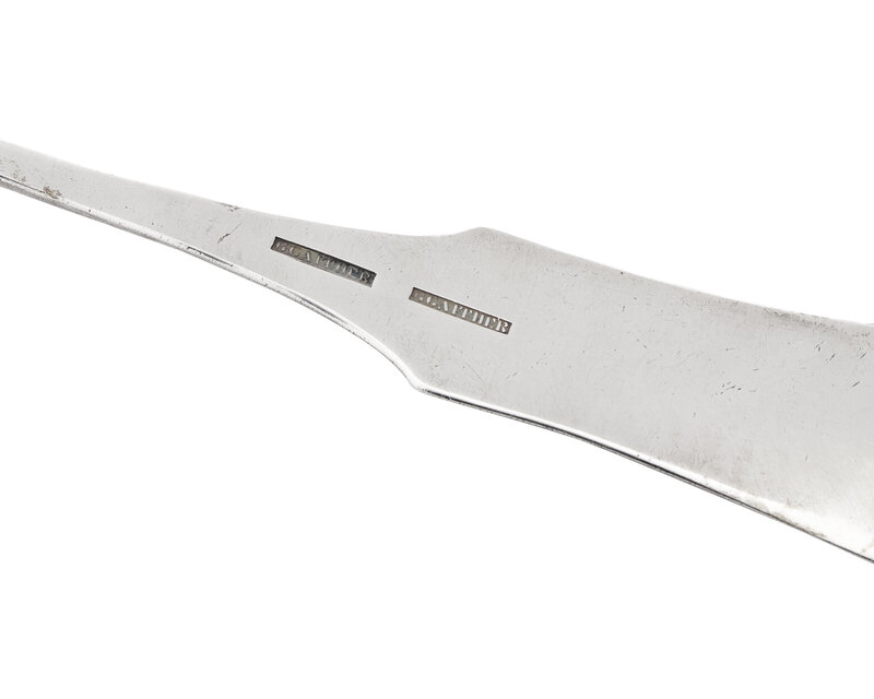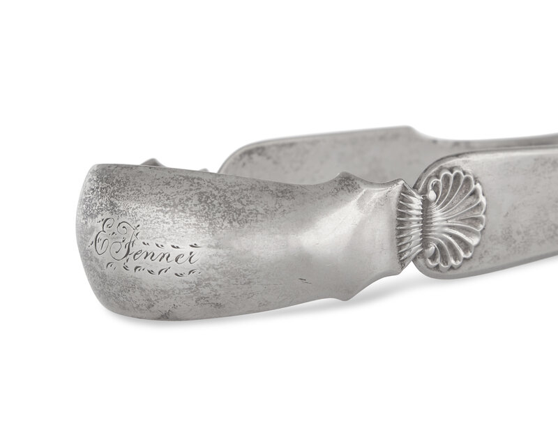 comprising a punch ladle, by Greenbury Gaither, with fiddle end, drop at bowl back, marked; and a sugar tongs, by Charles Alexander Burnett, with round bowls, cast shells on handles, and engraved with monogram, "E. Fenner," marked.