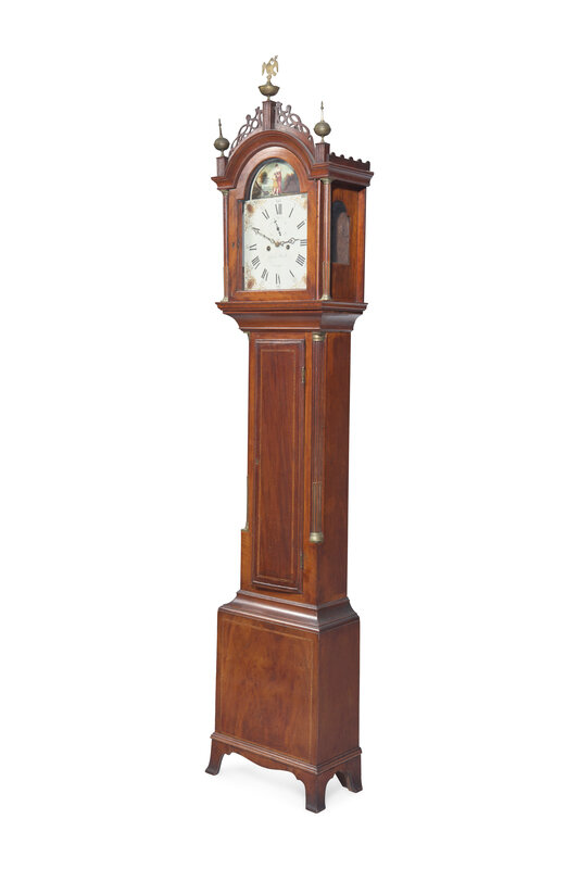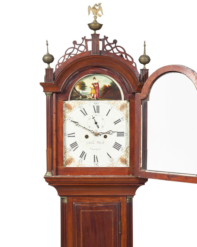 the hood with arched cornice with fretwork, surmounted by three brass finials, the central finial with eagle and laurel branch, the enamel-decorated face with depiction of mother and child to archway, inscribed, "Aaron Willard/ Boston," the case with inlaid door, fluted quarter columns, on inlaid molded base with shaped apron and French feet.