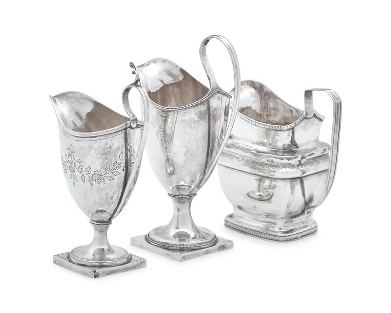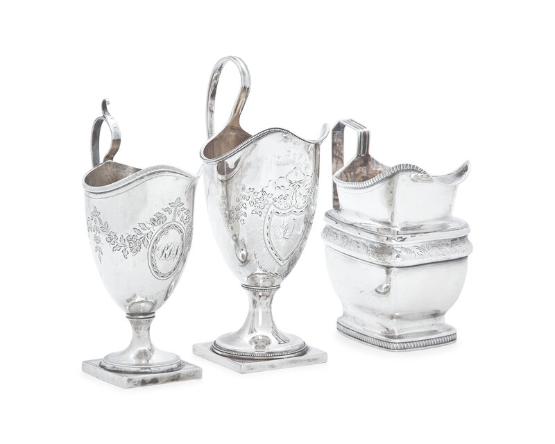 comprising one creamer by Daniel Dupuy, circa 1790, engraved with oval cartouche bearing monogram, "RLS," flanked by swagged floral garland, marked twice to underside; a creamer, circa 1790, engraved with be-ribboned shield-form cartouche bearing monogram, "SCL," surmounted by swagged floral garland, apparently unmarked; and a creamer, circa 1805, engraved with register of foliate motifs and gadrooned edges, apparently unmarked.