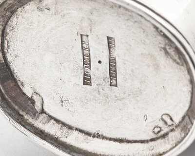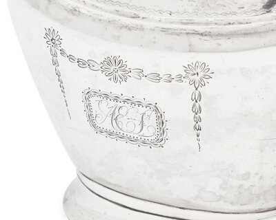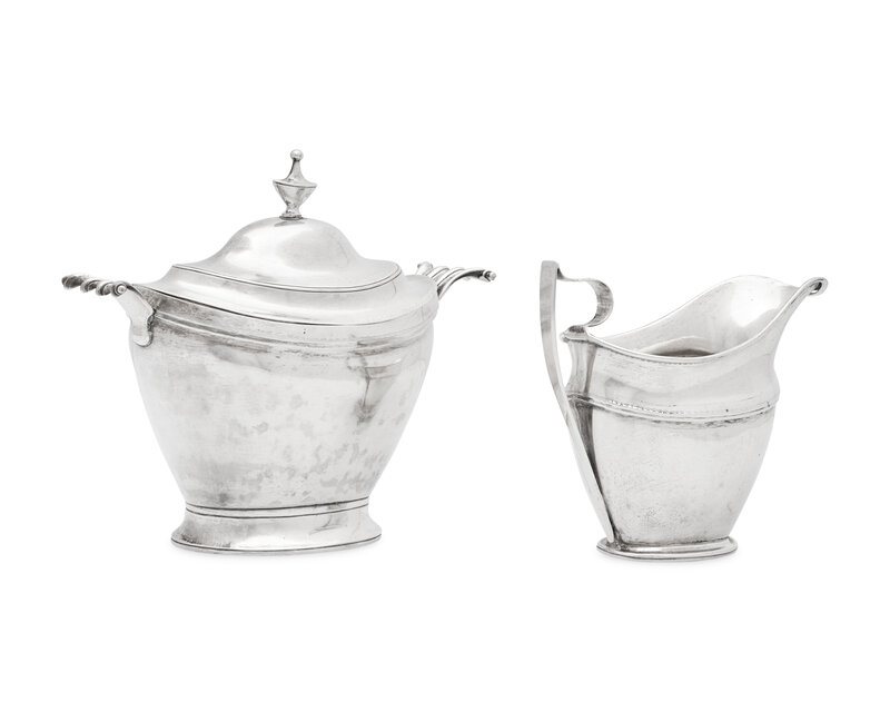 the covered sugar dish with "Onslow" handles, the lid with finial, the sugar dish and creamer both engraved with cartouche bearing monogram, "AEL," surmounted by floral garland, each marked twice to underside.