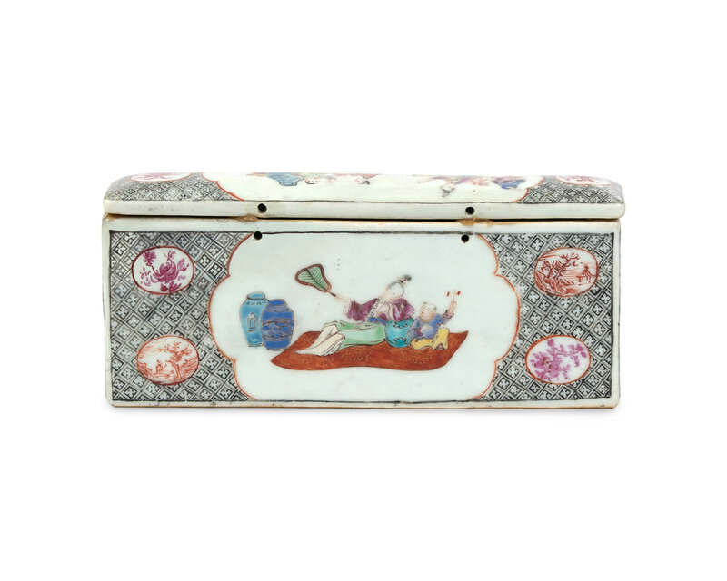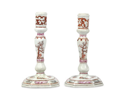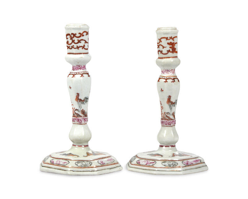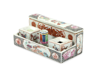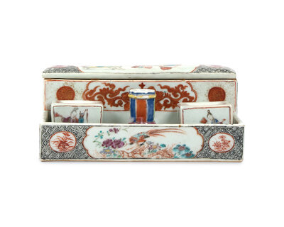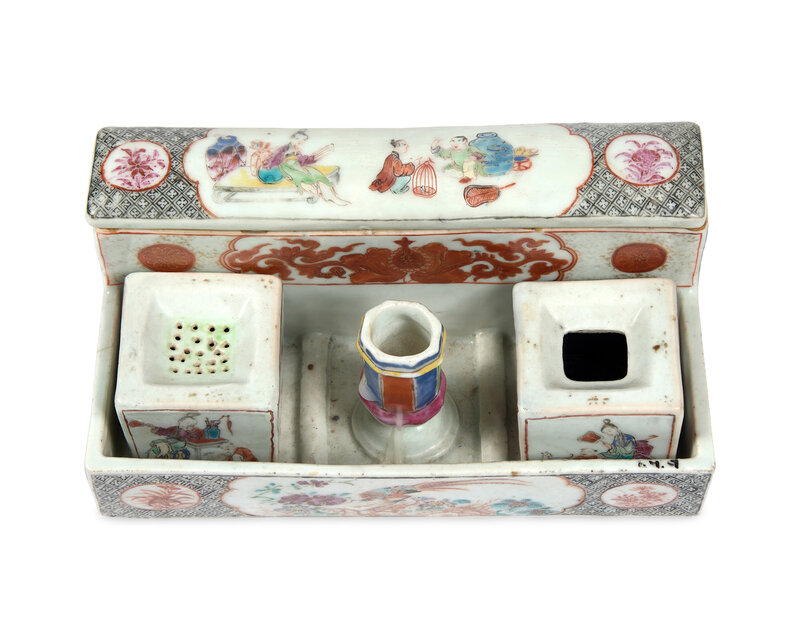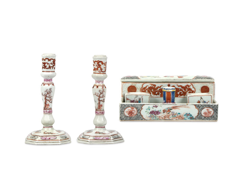 A Chinese Export Porcelain Famille Rose Inkstand And Pair Of Candlesticks