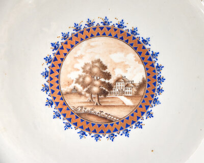 including a pair of blue-rimmed small plates and tea caddy decorated with a blue urn; a medium plate with sepia and gold banding decorated with an sepia urn and inscribed, "George Forbes"; three soup plates with blue borders centering a grisaille landscape; and a drum-form teapot with orange and gold banding decorated with a river scene.