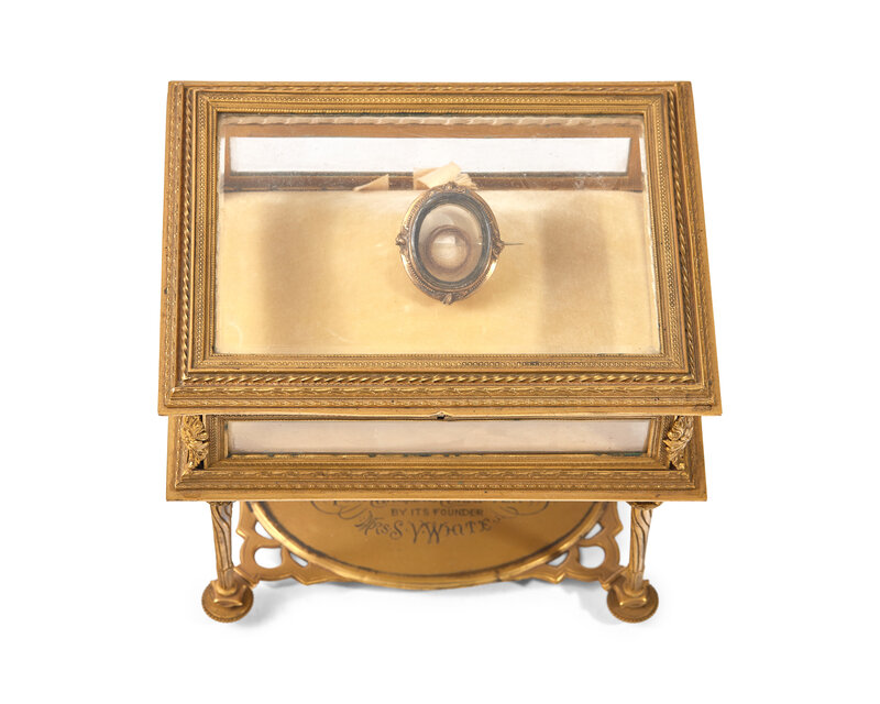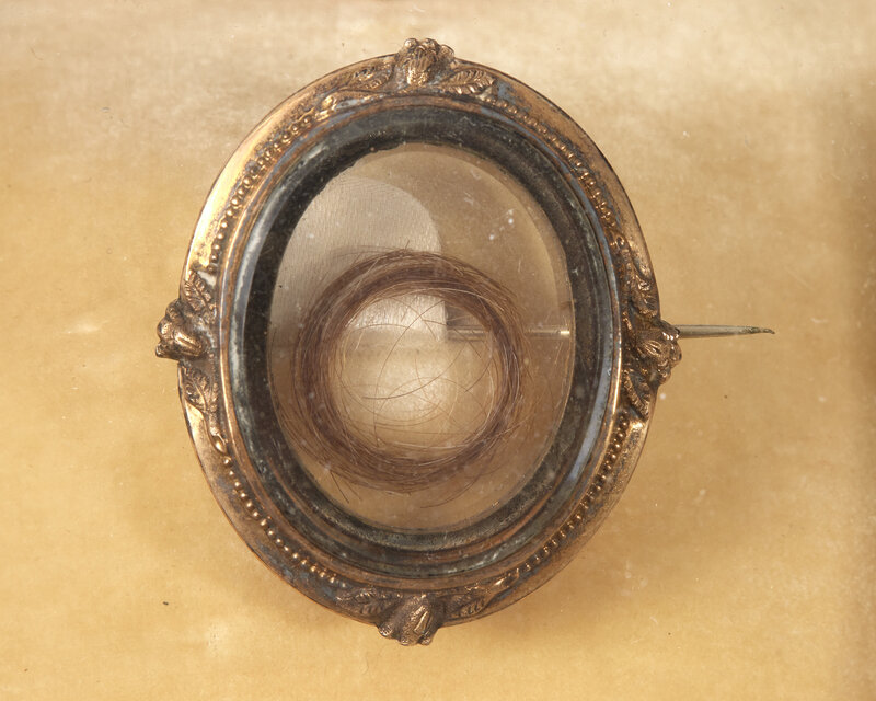 the vitrine with an engraved plaque reading, "Mourning Pin/ Containing the hair of/ General George Washington/ Presented Through/ Fort Greene Chapter/ By Its Founder/ Mrs. S. White", accompanied by a hand-written note, "When Geo. Washington died this pin was made as a mourning pin which was the custom in that day. It was given to Lucy Payne who married George Steptoe Washington. Lucy was the sister of Dolly Madison. She gave it to her granddaughter Eugenia Washington."