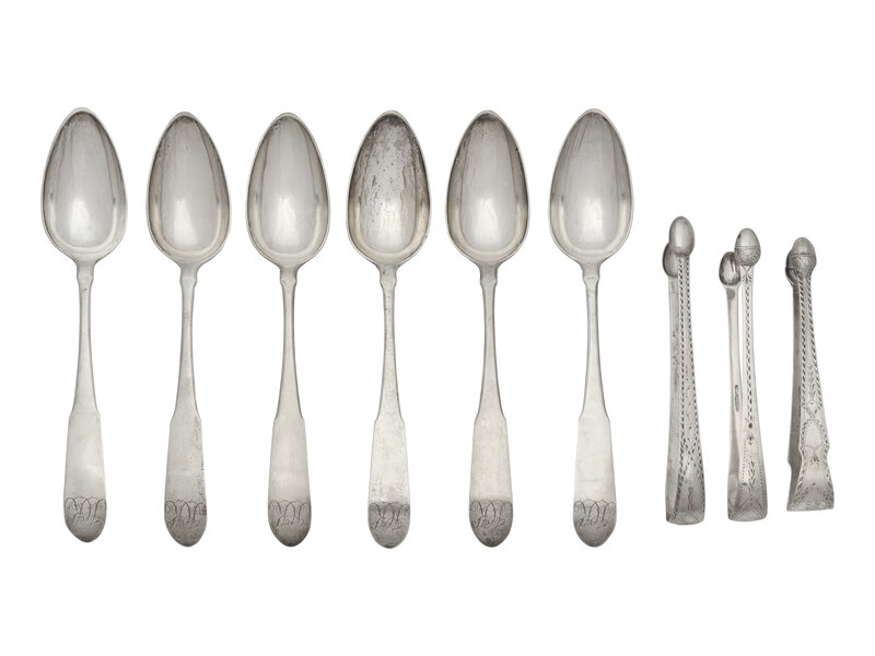 comprising a set of six tablespoons, by John Christian Wiltberger, engraved with monogram, "JCK," marked; two bright-cut sugar tongs by John Christian Wiltberger, one engraved with monogram, "AC," and the other engraved with monogram, "PES," marked; and a bright-cut sugar tongs by Samuel Alexander, engraved with monogram, "JAK," marked.
