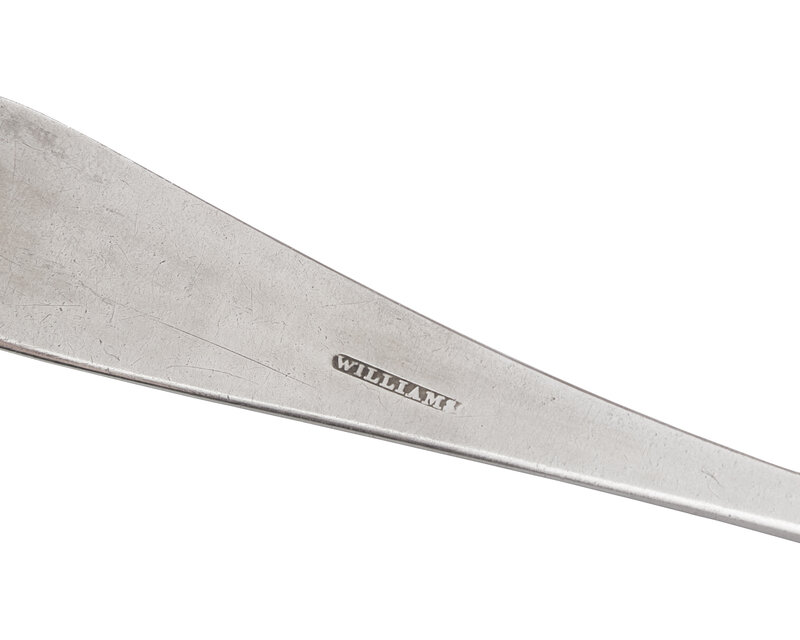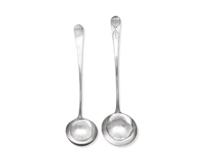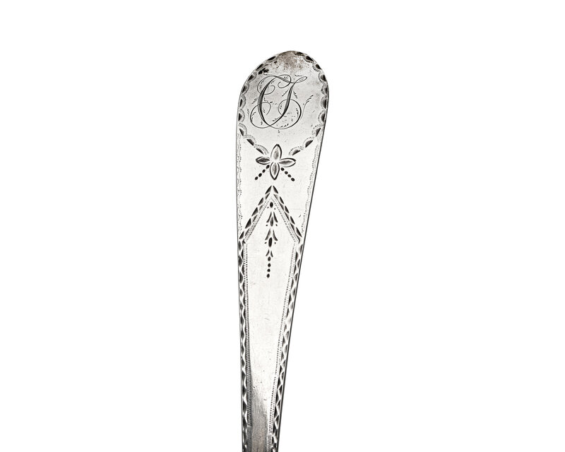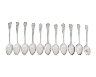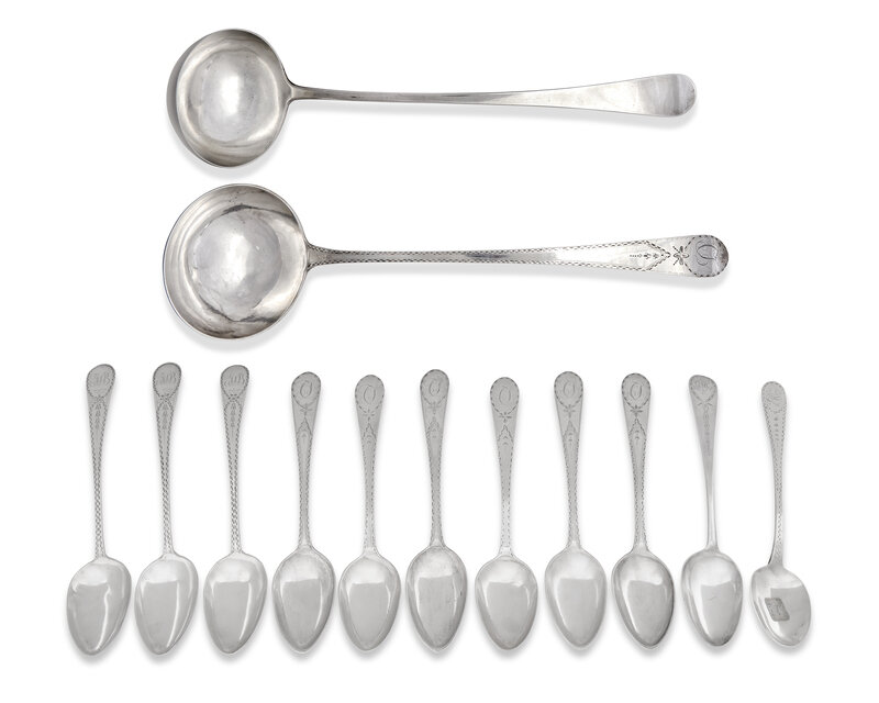comprising a punch ladle by Samuel Williamson (1772-1843), with drop at bowl back, marked; a set of three tablespoons by Samuel Williamson, with bright-cut decoration including an oval cartouche bearing monogram, "TSB," marked; a punch ladle and a set of six tablespoons by James Musgrave (active 1794-1813), all with bright-cut decoration including oval cartouche bearing monogram, "CT," marked; a single tablespoon, by James Byrne (active c. 1784-1799), with bright-cut decoration including oval cartouche bearing monogram, "GMS," marked; and a single tablespoon, by Joseph Anthony (1762-1814), with bright-cut decoration including oval cartouche bearing monogram, "EHCC," marked.