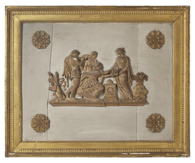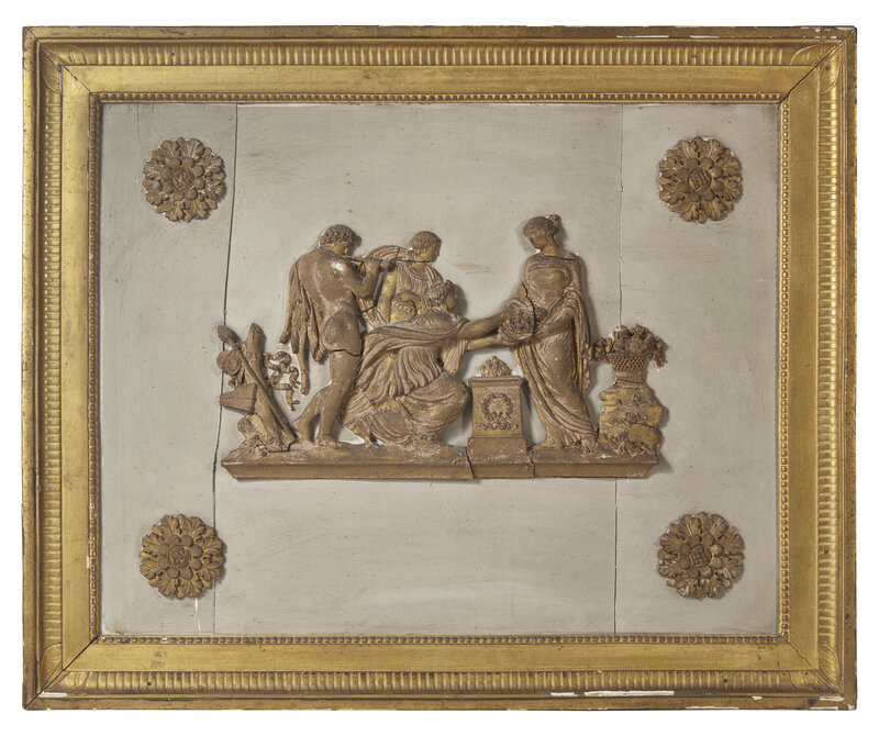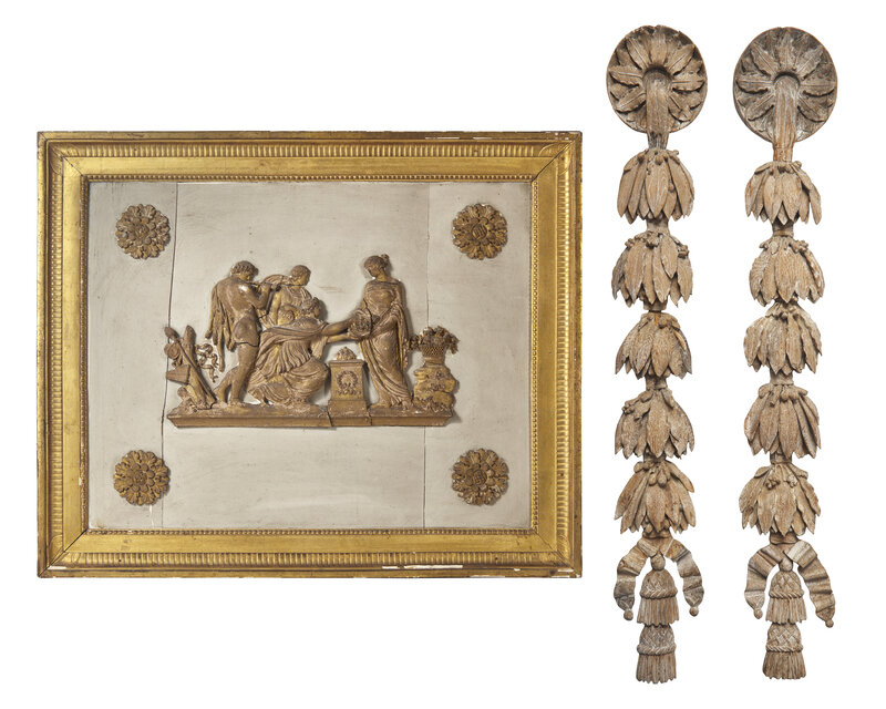 A Painted Panel With Applied Neo-Classical Figures And Pair Of Carved Wood Garlands