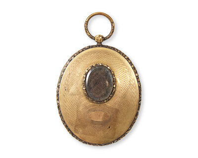 in a gilt metal pendant, the back with glazed aperature with hair, in a fitted leather case, accompanied by a hand-written note identifying sitter.