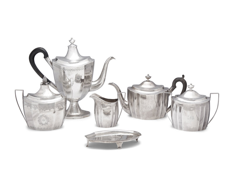 comprising a coffeepot, a teapot, two covered sugar dishes, a creamer, and a teapot stand, the teapot, a covered sugar dish, and creamer all bearing monogram, "SAJ"; the other covered sugar dish with pineapple-form finial, and teapot stand both bearing monogram, "MMTW", the coffeepot bearing monogram, "S"; all marked.