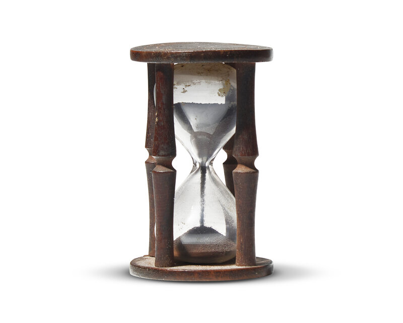 including a log sand glass retaining paper label fragments to base, accompanied by a canvas storage bag; a wooden harpoon cover with leather hinge; a fancy rope-worked sewing tool box; two whalebone fids; a wooden fid; a whalebone smoother; two whalebone walking sticks; five whaleboat mast hoops; and a turned and carved whalebone yarn swift.