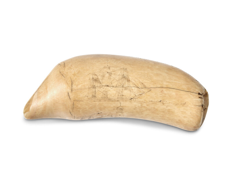 inscribed, "A Spermaceti Whale Tooth Taken by the Ship Atlantic Nov 8 1835. Lat 37.30 S. Lon 45.90 W," and decorated with a light house and keeper's house, a two whaling scenes.