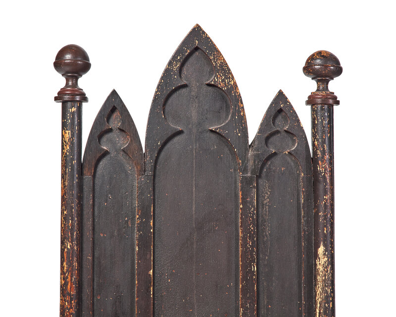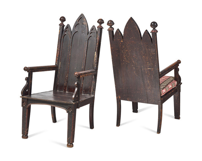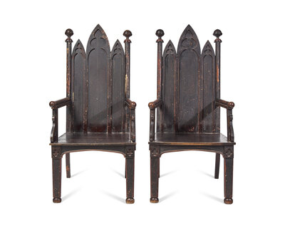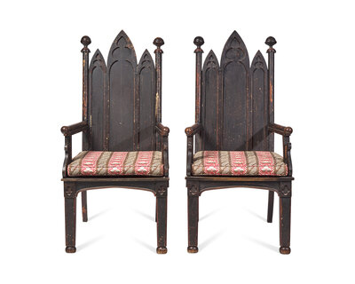 A Pair Of Painted Gothic Revival Carved Oak Armchairs