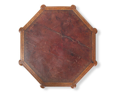 the top of octagonal form with outset corners, inset with embossed leather, the base with four downswept legs connected by panels carved with Gothic tracery.