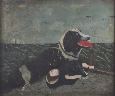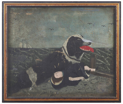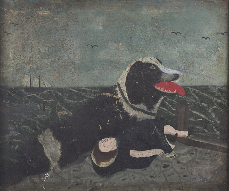 after the Currier & Ives lithograph, "He Is Saved," of 1857, which was based on the 1856 painting by Edward Henry Landseer (1802-1873), "Saved."