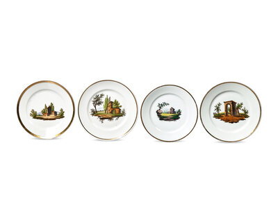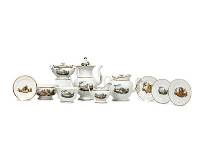 comprising a coffeepot, a teapot, a creamer, a cover sugar bowl, two waste bowls, and four plates, all decorated with various Tuscan landscapes, bearing various labels to undersides, including one label to one plate typed, "Mrs. T.D. Thacher."