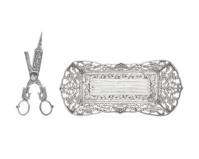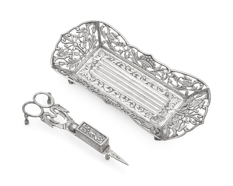 the reticulated tray cast and chased with birds, anthemia, and floral urns, on paw-form feet, the snuffer with cast and chased birds to finger holds, both marked with diamond shaped maker's mark, "A/ JM/ S," and with square-shaped standard mark, "10."