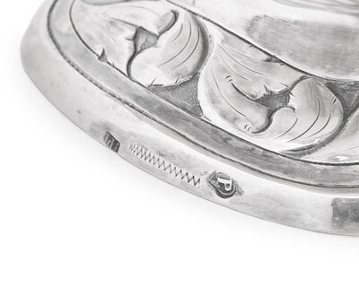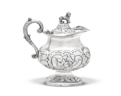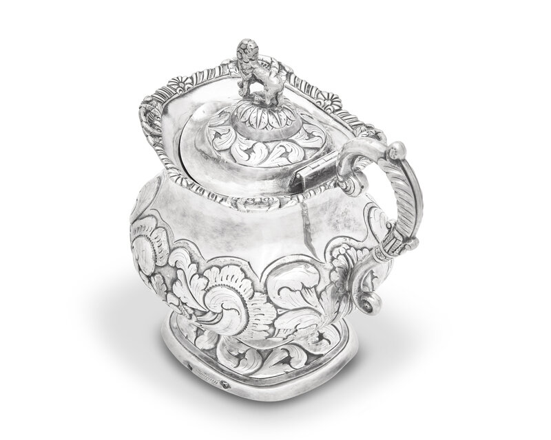 the lid with lion-form finial, marked twice with crowned "P" mark and marked three times with maker's mark, "JPL."