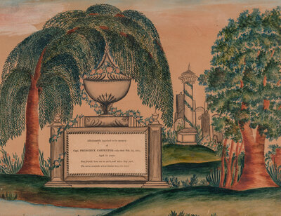 watercolor and ink on paper, the register reads, "Affectionately inscribed to the memory of Capt. Fredrick Carpenter-- who died Feb. 26, 1821, Aged 55 Years. Few friends have we on earth, and when they part, the nerve unwinds whose tension tears the heart."