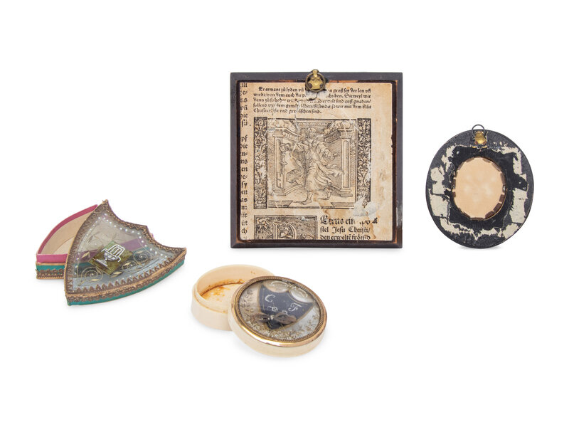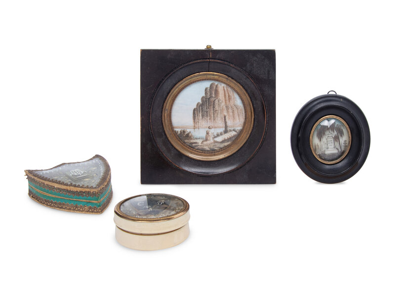 the first a circular bone box having shield-form inset lid initialed, "C F," with hairwork and seeds; the second a shield-form "Pennsylvania Memorial" box; the third a reverse-painted memorial scene inscribed, "Souvenir d'un Pere 1867," set within a frame; the last a memorial painting set within a frame.